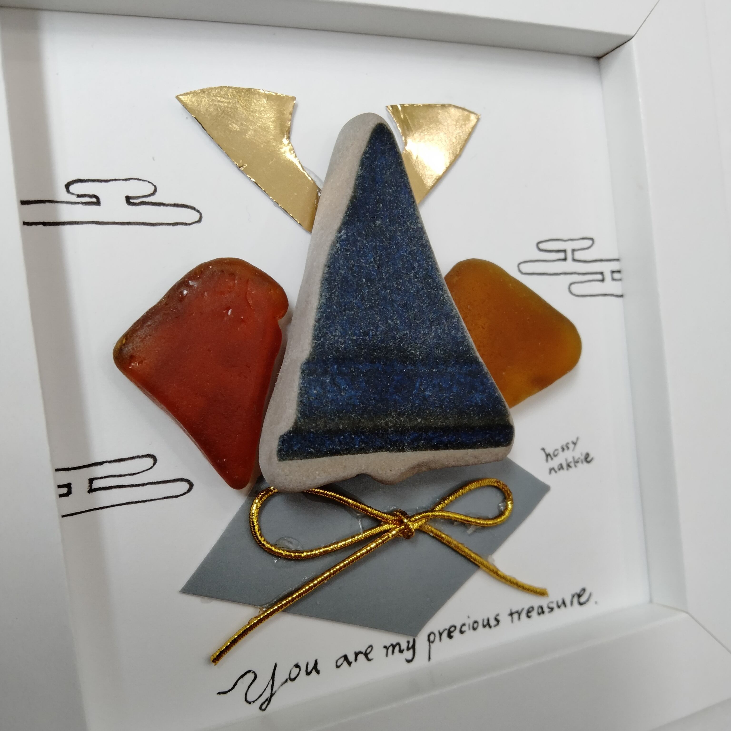 シーグラス、シー陶器、ゴム紐、厚紙、ペン、用紙、接着剤